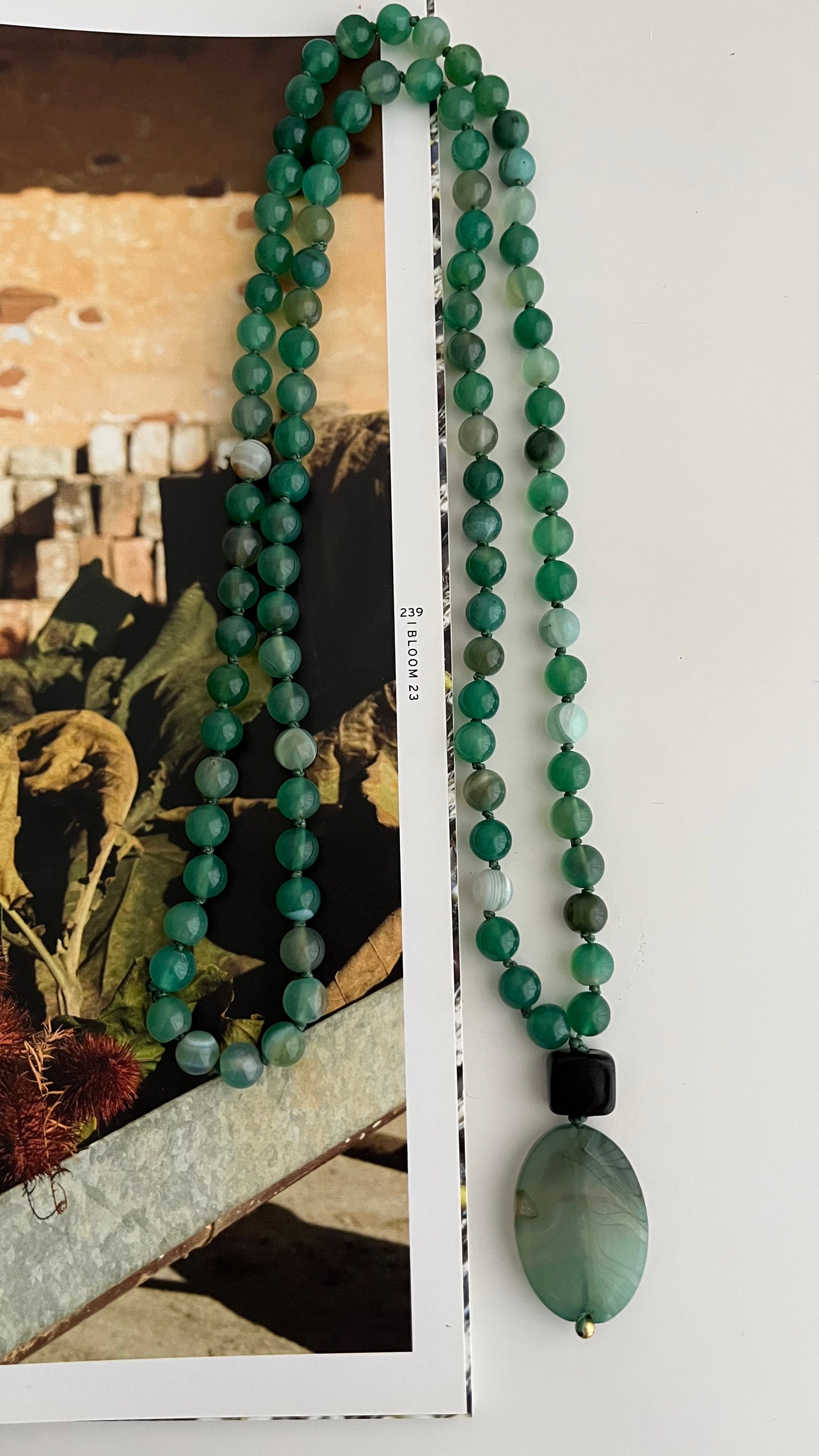 Colar longo em pedras naturais, quartzo verde, com pingente também em pedra natural.