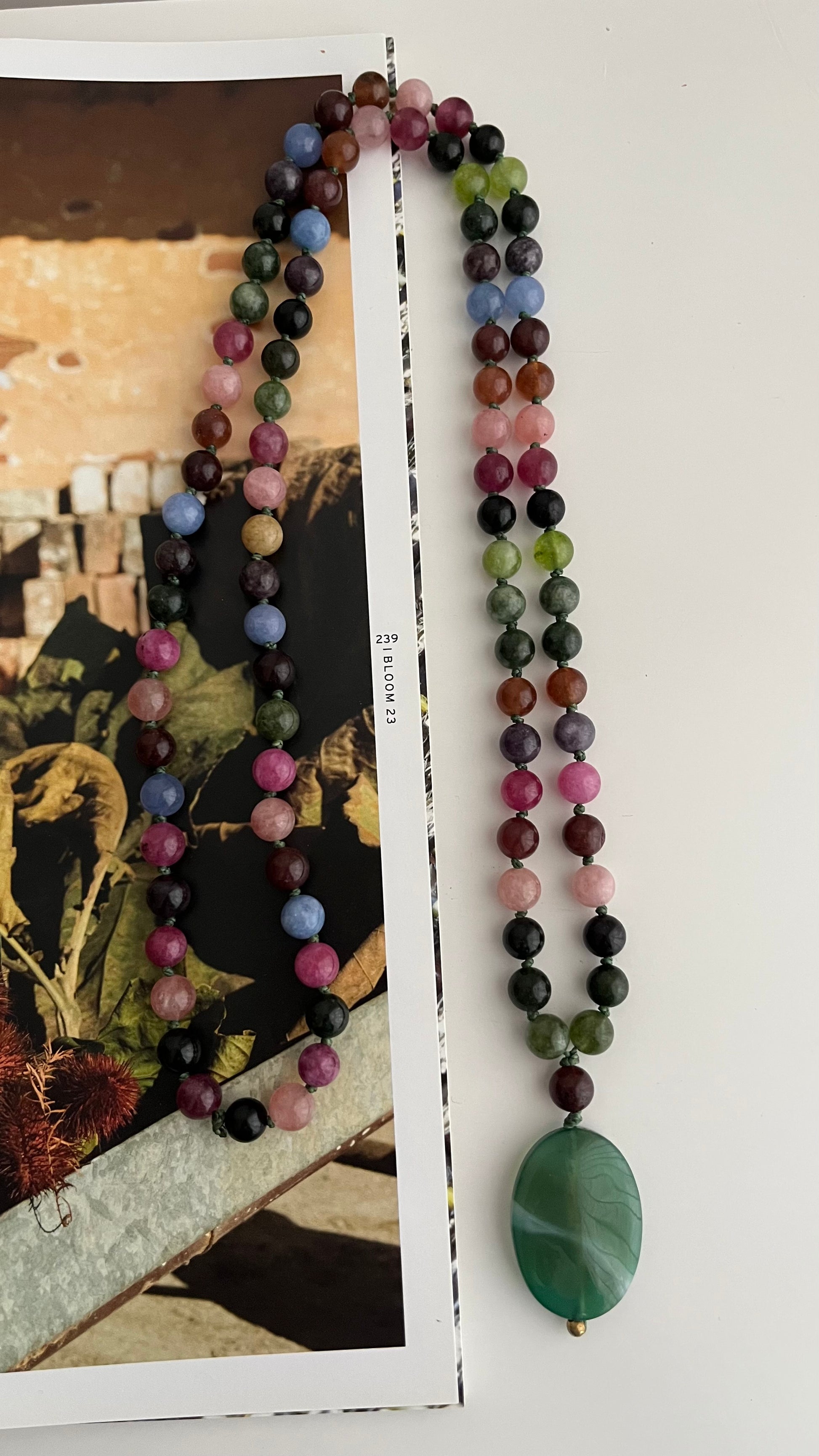 Colar longo em pedras naturais, jade colorida, com pingente também em pedra natural.
